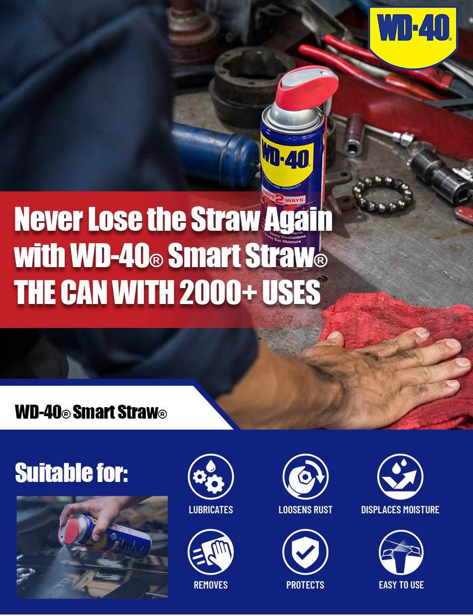 382ml SMART STRAW - NEVER LOSE THE STRAW AGAIN WITH WD-40 SMART STRAW. It features a permanently attached straw that sprays two ways. Simply flip it up for a precision stream and down for a regular spray action.