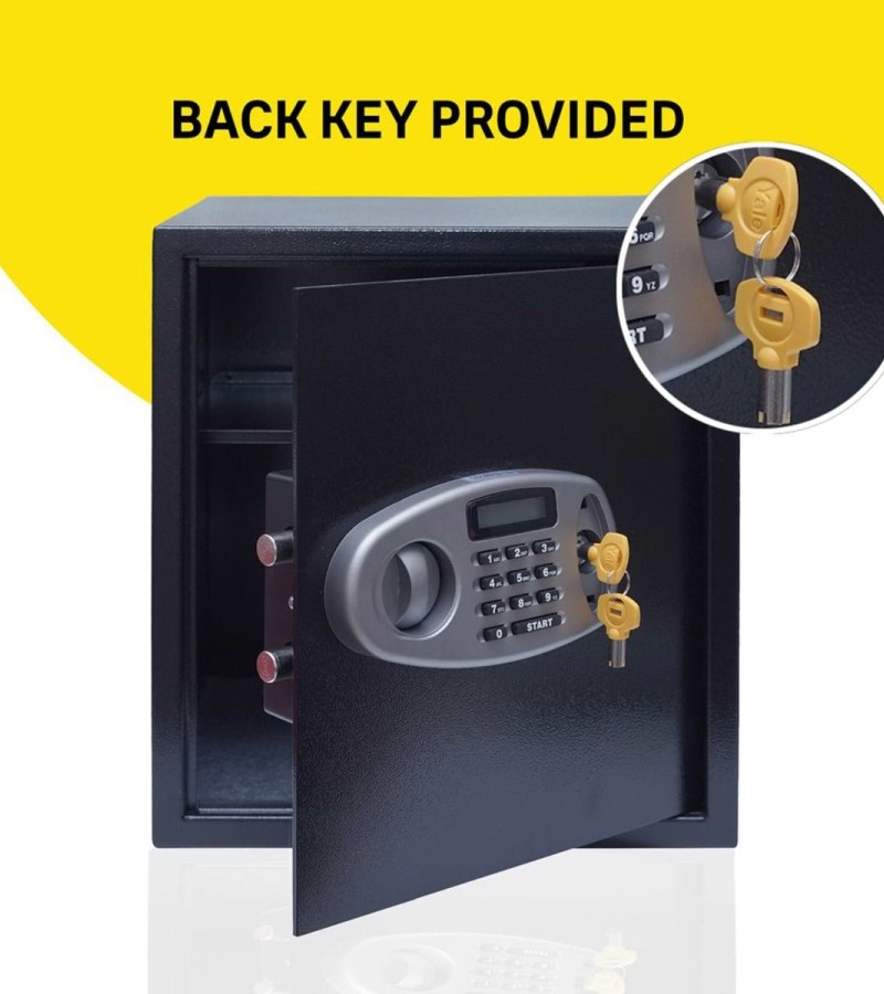 Bring the Yale 41 Litres Digital Safety Locker which helps in protecting the things that matter the most to you. Equipped with 41 litres capacity, it will keep your most important belongings secured. Designed with a strong steel body and 16 mm secure bolts and with a pin code, you are able to gain quick access to your safe. Also, the steel construction with carpeted floor helps to protect against scratches and damages. The Yale 41 Litres Digital Safety Locker nicely accommodates a wide range of items, including legal documents, passports, jewellery, cash, and more. Whether that’s your camera to capture those special moments or a sentimental belonging, this can be the ideal locker you are searching for. The Yale 41 Litres Digital Safety Locker is convenient to operate having a digital keypad with LCD display and a programmable combination of 3 to 8 digits. The electronic lock and digital pin access offer quick set-up and easy operation. Inputting the incorrect code 4 times sounds an internal alarm for 3 minutes and locks out the code pad for that time. It uses 4 AA size batteries (1.5 Volt). In case of battery failure, the safe can be operated with a manual override function with 2 security override keys supplied. It comes with pre-drilled holes (fixing bolts supplied) which allows permanent mounting to floors, walls, or most hard surfaces for additional security.